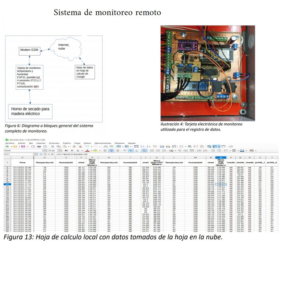 En este video se muestra el desarrollo de una tarjeta electrónica para realizar el monitoreo de un proceso de secado de madera en horno convencional para lograr un contenido de humedad en equilibrio en la madera a partir de monitorear la humedad relativa y temperatura ambiente dentro del horno de secado, con base en estos parámetros la tarjeta calcula el contenido de humedad en equilibrio de la madera, a su vez esta información es enviada a una hoja de cálculo en la nube de google lo que permite registrar los datos de forma permanente mientras este en funcionamiento la tarjeta electrónica. 12-Mayo-2024